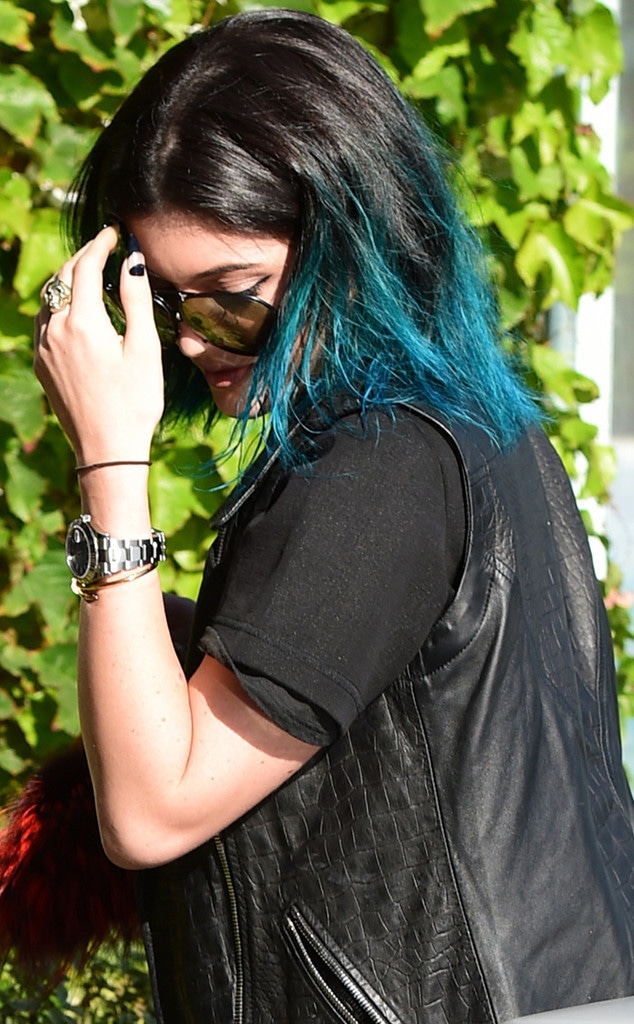 Kylie Jenner stepped out in New York City last week giving us sultry fashion inspo by rocking an unbuttoned cardigan a low-cut top underneath and baggy blue jeans. Kylie-jenner-peacock-blue-hair-color- Find this Pin and more on hair colour by Glitter Life. Personality Kylie Jenner arrives at the 2014 Billboard.